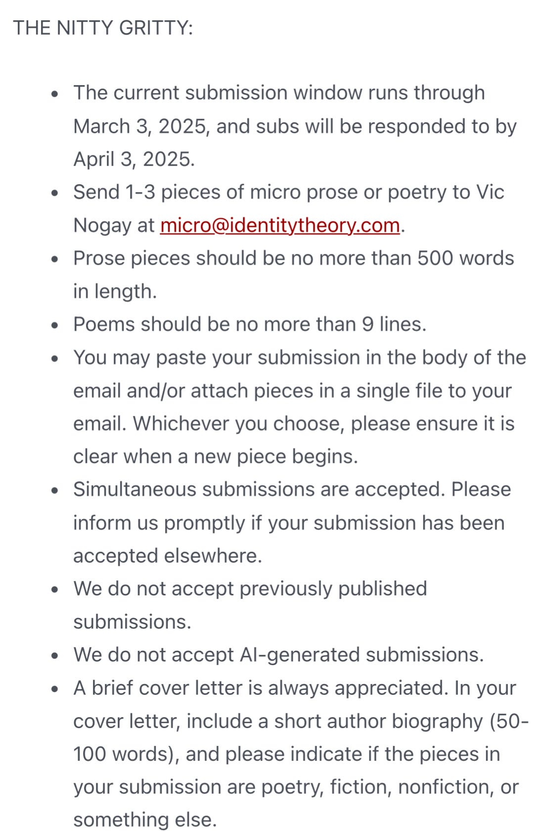 I had initially thought I wanted to let things simmer before opening submissions for Micro Monday season three. Calm down, find some emotional regulation and a stable headspace. But, in the midst of all this—an unhinged tyrant, billionaires dismantling our American democracy, a compromised court, a passive congress, erasure of marginalized people, a great silencing—I decided, fuck it, let’s get to work.